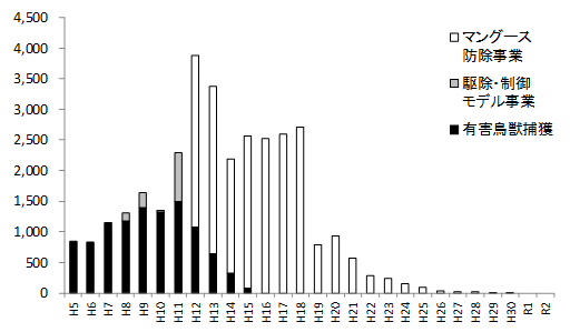 環境省は奄美大島に生息するアマミノクロウサギやアマミヤマシギ等の在来種を含む奄美大島固有の生態系を保全することを目的に、奄美野生生物保護センターを拠点として、平成12(2000)年度に奄美大島においてマングース駆除事業を開始した。平成17(2005)年度からは外来生物法に基づく防除事業を開始し「奄美マングースバスターズ」を結成するなど、防除の強化を図ってきた。平成25(2013)年度には、令和4(2022)年度までの10年間で奄美大島からのマングース根絶を目標とする第2期防除実施計画を策定し、その計画に基づいて防除作業を進めている。令和2(2020)年度は32~33名の奄美マングースバスターズ体制で捕獲作業等を実施した。また、特定地域(岩崎産業(株)社有林内またはその周辺のマングース分布域)においては、平成20(2008)年度より別途の体制(令和2年度捕獲従事者6名体制)で捕獲作業等を実施している。このような体制により、現在はマングース分布域の全域で捕獲作業等を実施することが可能となっている。