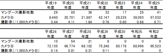 表5.平成19年(2007)年度から令和2(2020)年度までのマングース撮影枚数および撮影率