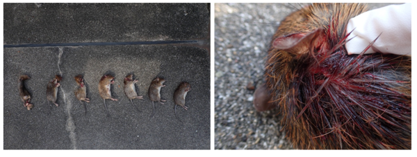 死因を特定するため、環境省から国立環境研究所に遺伝子検査を依頼したところ、全個体の出血を伴う皮膚小孔(咬傷と考えられる)周囲の毛からネコの遺伝子が検出された。