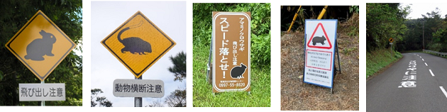 ・アマミノクロウサギだけでなく、ケナガネズミやトゲネズミ等希少野生動物の交通事故も近年確認されています。交通事故は林道のみならず、スピードの出やすい国道・県道上でも発生しています。交通事故が多発している地点には、下写真のような警戒標識などが設置されています。動物が活動する夜間は、特に標識設置場所では注意し、野生動物が急に飛び出してきてもすぐに止まれる速度まで減速していただくようお願いします。