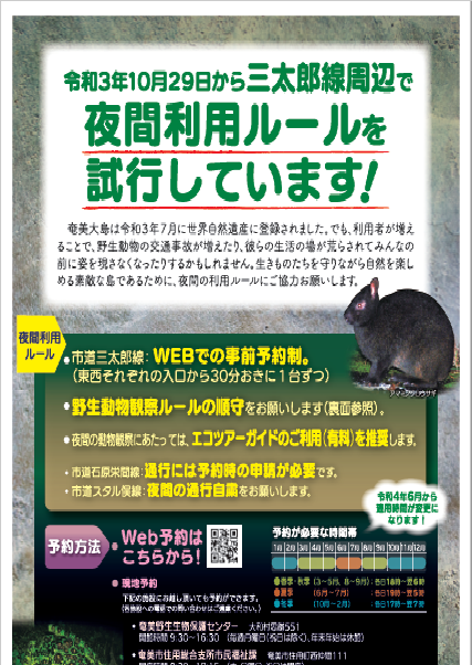 令和4年6月1日(水)から、奄美大島の市道三太郎線、市道スタル俣線及び市道石原栄間線周辺における夜間利用ルールの適用時間を変更※します。併せて、令和4年6月1日(水)から事前予約の受付枠が変更になります。野生動物の保護と質の高い利用の両立に向けて、ご理解とご協力をよろしくお願いいたします。