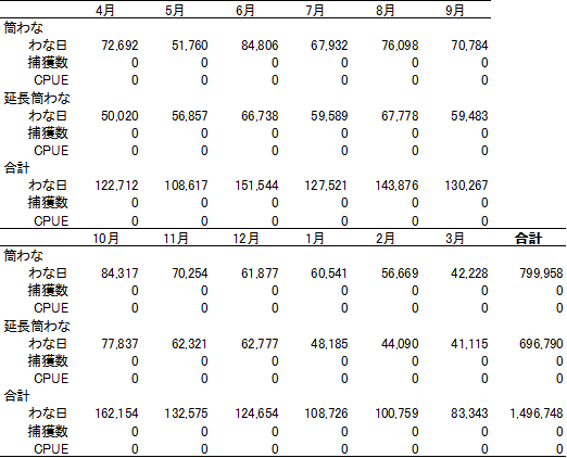 表1.捕獲数・捕獲努力量・CPUEの経年推移