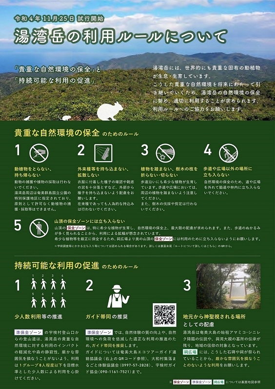 湯湾岳の貴重な自然環境の保全と、その自然環境を損なうことなく利用していくために守るべき湯湾岳利用ルールを策定し、令和4年11月25日(金)から試行を開始しますので、お知らせいたします。希少な動植物の生息・生育地の保全と、より質の高い持続可能な利用の両立に向けて、ご理解とご協力をよろしくお願いいたします。