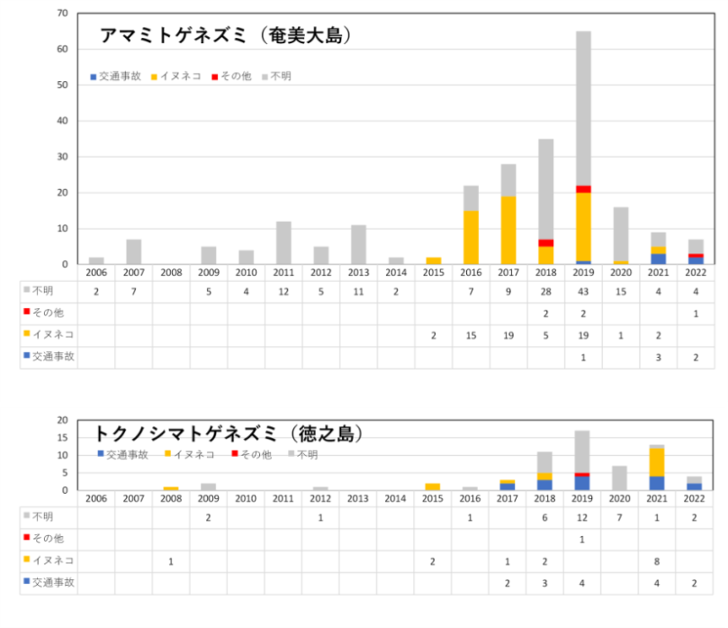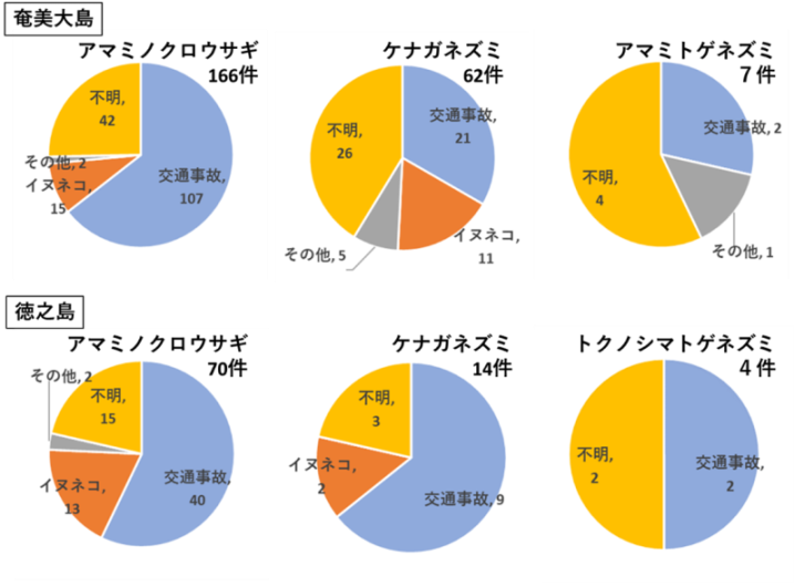 図1 奄美大島と徳之島において回収された希少種の死因内訳(2022年)