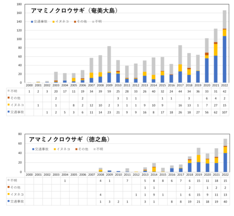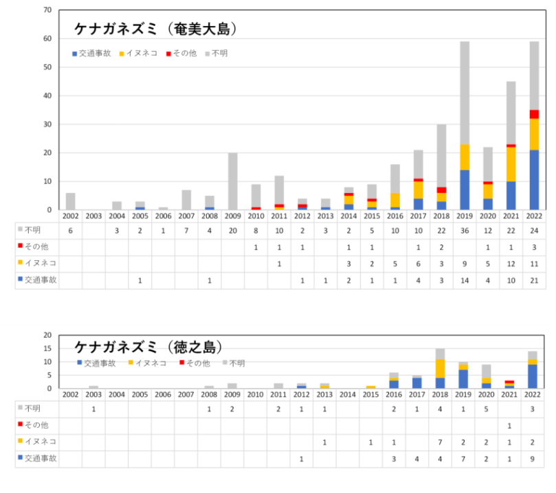 ・2022年の交通事故の確認件数は、奄美大島ではアマミノクロウサギ107件(死体105件、救護のち死亡2件)、ケナガネズミ21件、徳之島ではアマミノクロウサギ40件(すべて死体)、ケナガネズミ9件が確認されました。