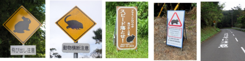 ・アマミノクロウサギだけでなく、ケナガネズミやトゲネズミ等希少野生動物の交通事故も近年確認されています。交通事故は林道だけでなく、スピードの出やすい国道・県道上でも発生しています。交通事故が多発している地点には、写真のような警戒標識などが設置されています(図4)。動物が活動する夜間は、特に標識設置場所では注意をお願いします。
