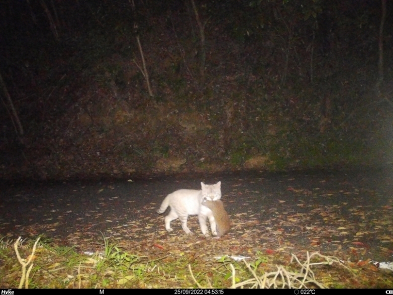 ・現在、奄美大島と徳之島では、森林域に生息するノネコの捕獲事業を行っています。捕獲されたノネコの糞からは、多くの希少種が検出されています。また、センサーカメラによるモニタリングでも、希少種を咥えたノネコが多数確認されています。希少種保全のため、事業へのご理解とご協力をお願いいたします。