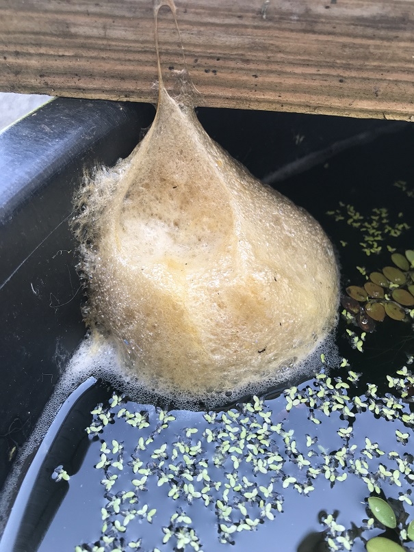 また、木の枝やコンクリート壁面等に生み付けられる泡巣(泡状の卵塊)を発見した際