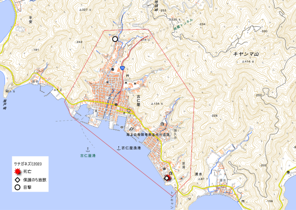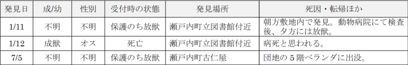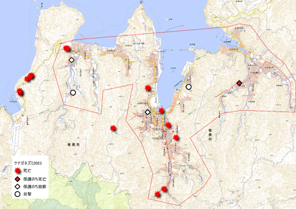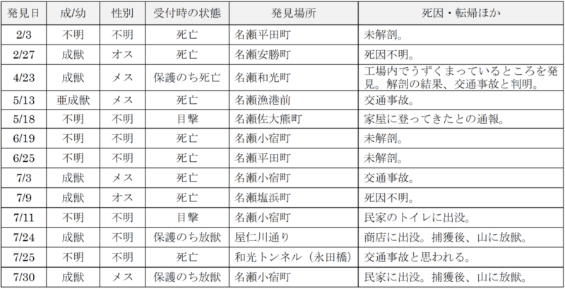 令和5年1月から7月25日までの間に、奄美市名瀬市街地で10件、瀬戸内町古仁屋近辺で3件の救護及び死体回収がありました。未解剖で死因が確定できていないものもありますが、そのうち3件が交通事故(ロードキル)と判明しています。このほかに、民家や商店などに侵入したという目撃情報が名瀬市街地で3件確認されています。