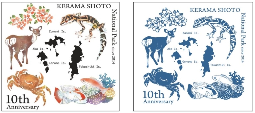 作成のデザインコンゼプトについては、コーナーに公園の指定年と10周年のロゴ、中央には慶良間諸島の島々のシルエットと4つの有人島の名前を配置して「地域と共に歩む国立公園」を表現。その周囲には、慶良間諸島ならではの自然として、全て名前に「ケラマ」とつく動植物のイラストを配置(上から時計回りにケラマトカゲモドキ・ケラマハナダイ・ケラマサワガニ・ケラマジカ・ケラマツツジ)。落ち着いたトーンで全体をまとめ上げて慶良間諸島国立公園のテーマである「リトリート」の雰囲気を表現すると共に単色版ではケラマブルーをイメージした色遣いとしてあります。