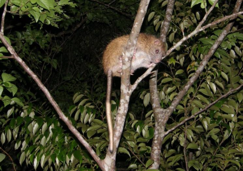 ケナガネズミは奄美大島、徳之島、沖縄北部にのみ生息するネズミ科の動物で、国内で最も大きなネズミです。30㎝程度の長い尾の先端半分が白いことや、体に長い毛が生えていることが特徴です。夜行性で樹上性が強く、木の実や昆虫類、カタツムリなどを主食としています。森が途切れている所では、電線や道路上を歩く様子がしばしば見られています。絶滅のおそれのある野生動植物の種の保存に関する法律(種の保存法)では国内希少野生動植物種に、文化財保護法では国指定天然記念物に指定されています。徳之島では、どんぐりの豊作やノネコ対策などの外来種対策の効果等もあり、個体数が増加してきている可能性があります。今後、特に山裾の集落では出没が増加していく可能性があります。