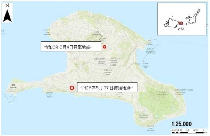 ② 捕獲場所:小浜島南西部(オヤケアカハチの森周辺)(下図参照)