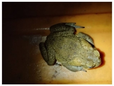 オオヒキガエルは全長が8~15cm 程度で、耳腺が目立ち、背中にある一面のイボイボが特徴です。オスは「ボボボボボ・・・・」と機械音のような鳴き声をし、夜間には街灯等の光に集まる虫を捕食するために明るい場所に出没します。