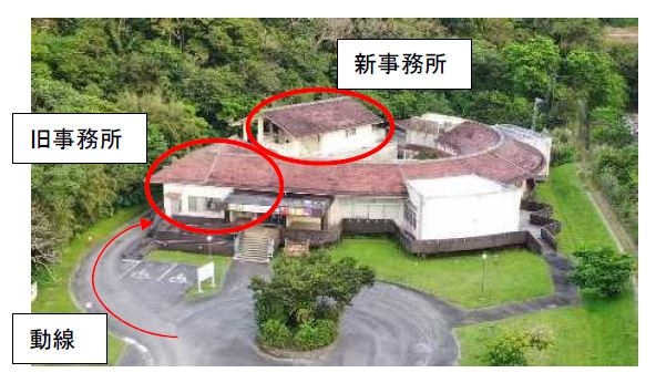 やんばる野生生物保護センターをやんばる世界遺産センターに改修するにあたって、やんばる野生生物保護センター内に併設されていたやんばる自然保護官事務所を敷地内の別施設(研究棟)2階に移転します。