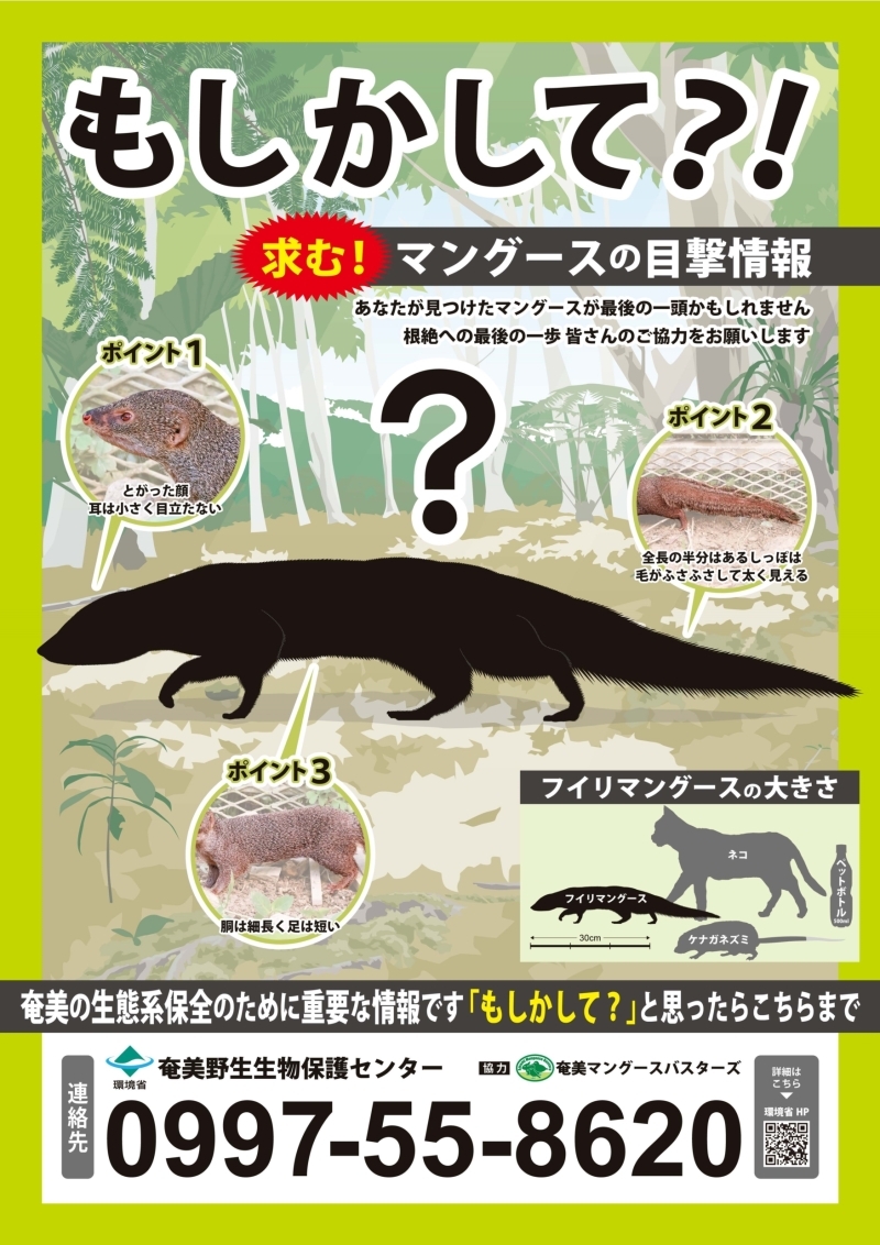 本計画に基づく侵入監視の取組みの実現には、島の皆さまの協力も欠かせません。奄美大島にお住まいの皆さまには引き続きマングースと思われる動物の目撃情報を求めています。マングース、シロアゴガエルなどの外来生物を発見したかも知れないと思われるような情報があれば、奄美野生生物保護センター(0997-55-8620、RO-AMAMI@env.go.jp)にご連絡ください。