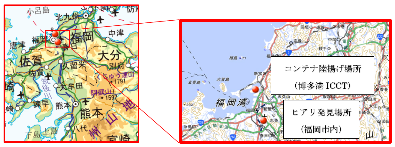 平成29 年7月21 日に福岡市東区博多港のコンテナヤードのアスファルトのくぼみで特定 外来生物ヒアリ(Solenopsis invicta)が確認されました。その後、港湾管理者が内部にヒア リが混入している可能性があるコンテナを特定し、8月17 日に当該コンテナを開けて内部を 検査したところ、約300 個体のヒアリ(生体約20 個体を含む)が確認されましたので、お知 らせします。 生きた状態で確認された個体については、全て薬剤で殺虫処理しており、また当該コンテナ 内部及び荷物については燻煙消毒を行いました。