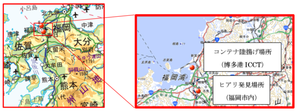 平成29年7月27日(木)に福岡市博多区の事業者敷地において同事業者により発見されたアリについて、専門家による種の同定の結果、同日中に特定外来生物であるヒアリ(Solenopsis invicta)と確認されましたので、お知らせします。 当該ヒアリは、中国・広東省の蛇口港より出航した貨物船にて、福岡市東区の博多港アイランドシティ・コンテナターミナル(以下、ICCT)で陸揚げされ、陸路にて福岡市博多区の事業者敷地に運ばれた貨物コンテナ(1個)内より発見されたものです。 発見時に確認された個体については、すでに全て殺虫処理していますが、確認地点付近やコンテナが一時的に留め置かれた地点周辺では、福岡市と協力してベイト剤等を設置しており、今後ヒアリの調査を行う予定です。