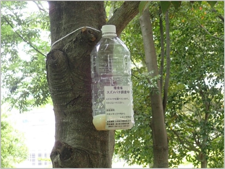 令和4年5月19日から6月6日にかけて、各個体の確認地点から3km圏内を中心に、公園や緑地、樹林地等、ツマアカスズメバチの営巣の可能性がある場所に約600個のトラップを設置しました。また、同期間中、同様の範囲において個体及び巣の目視調査を併せて行いました。これらの調査の結果、久山町において1個体(オスバチ)が確認されました。