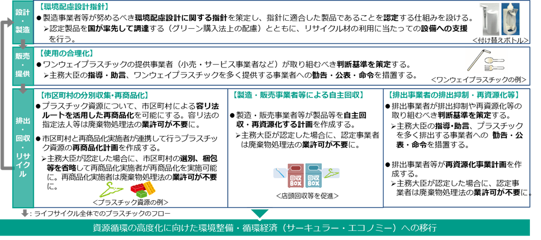 ラスチック資源循環法第33条に基づき、市区町村が単独又は共同して再商品化計画を作成し、これを主務大臣が認定した場合に、これまで容器包装リサイクル法において市区町村と再商品化事業者のそそれぞれで行っていた選別、圧縮等の中間処理工程の一体化・合理化が可能になる制度です。