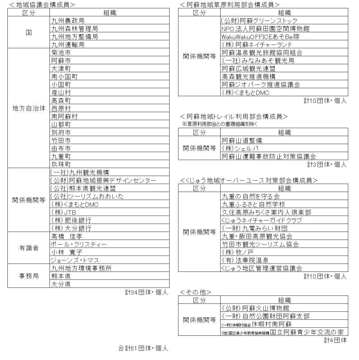 | ◆取材・傍聴に関する問い合わせ先 協議会事務局:九州地方環境事務所阿蘇くじゅう国立公園管理事務所 TEL 0967-34-0254 E-mail NCO-ASO@env.go.jp 担当:渡辺 |
