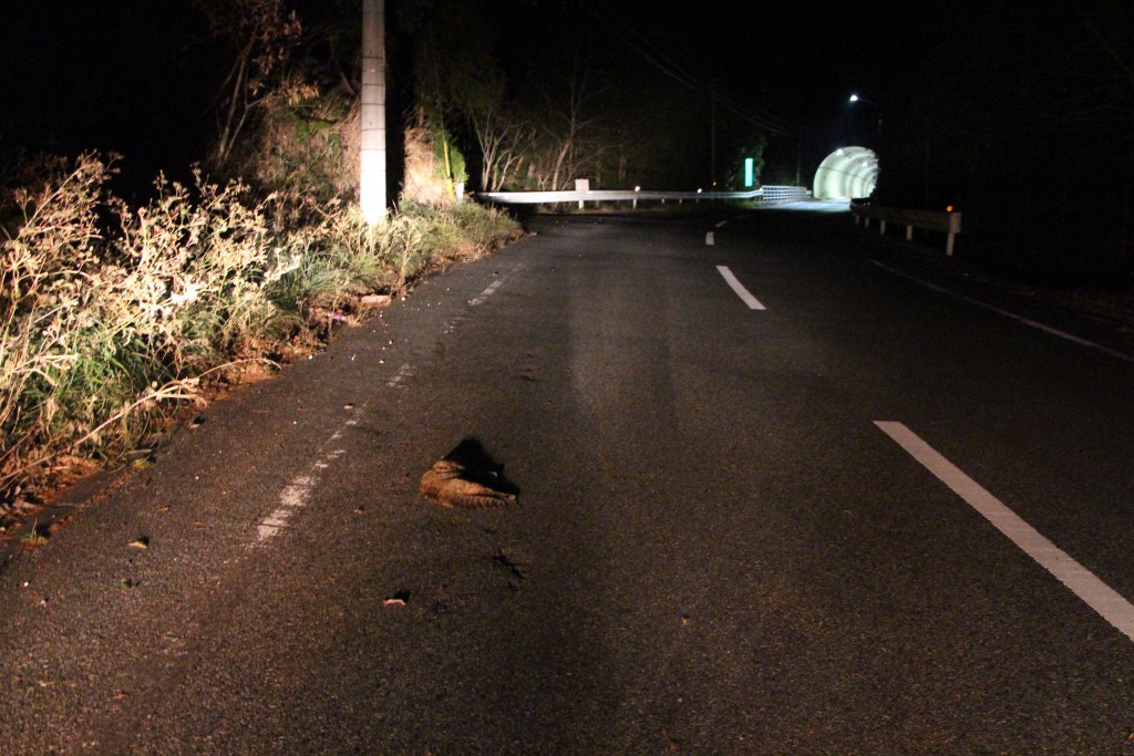 後の現場検証の結果、近くには林道と河川がありました。寒い中で餌を求めて山や川岸から道路に出てきてしまったのでしょうか。