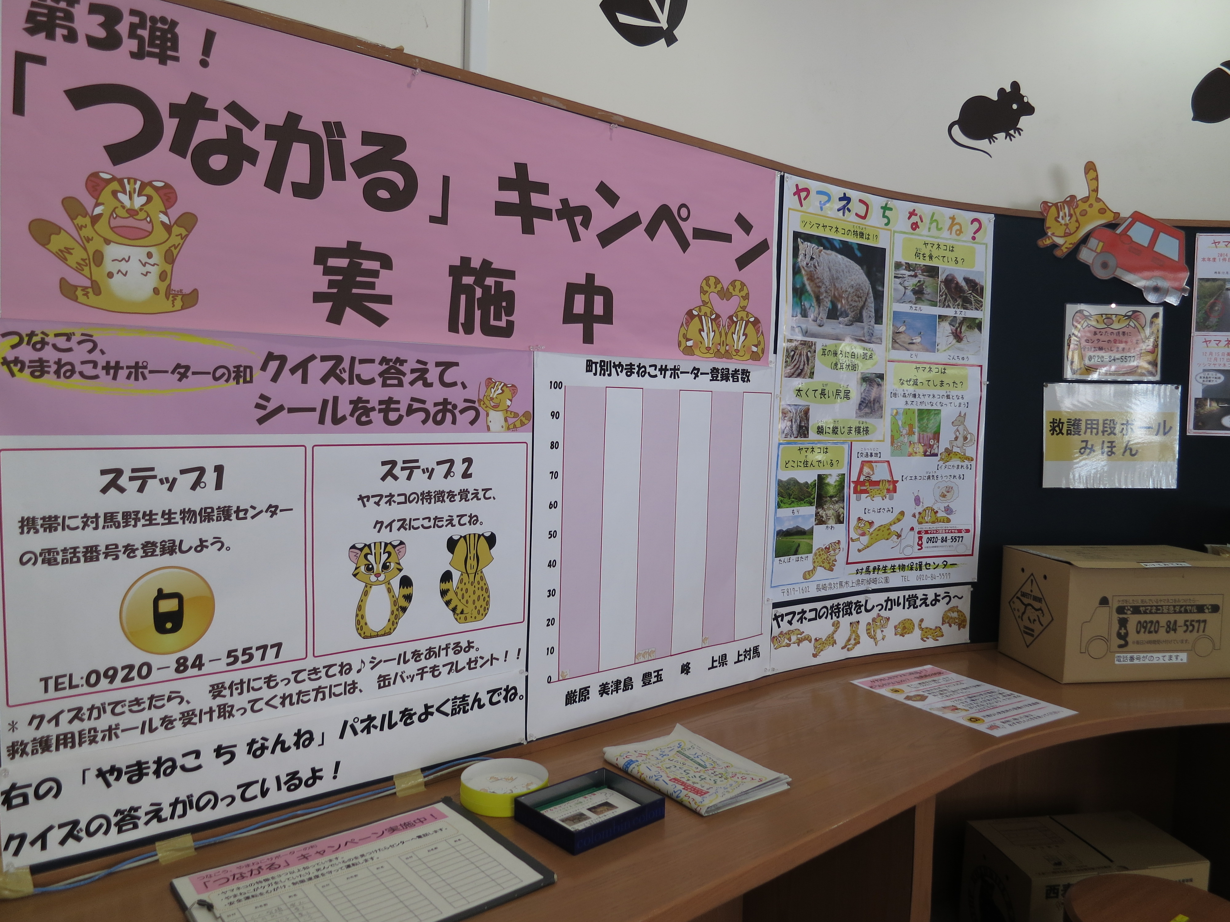 このキャンペーンは、センターの電話番号を携帯電話に登録いただき、さらにヤマネコの特徴をしっかり覚えてもらうことで、万が一ケガをしたり、死んでいるヤマネコを見つけたときには、すぐにセンターまで連絡を入れてもらえるようにするためのものです。今回、キャンペーン参加者には、可愛いヤマネコシールをお配りしています。また、救護用段ボールも受け取っていただき、車への搭載にご協力いただいた方には、缶バッジもお渡ししています。みなさん是非センターまでお越し下さい(^^)/ お待ちしています!!