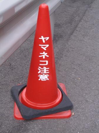 『ヤマネコ注意』と書かれたコーンを
