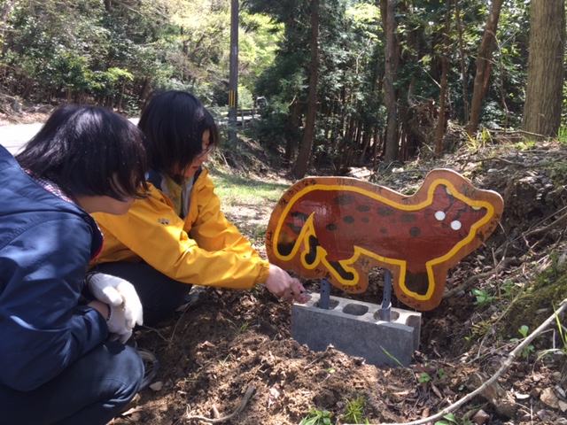 ツシマヤマネコ応援団と設置しているヤマネコ型看板