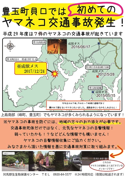今年度の交通事故はAM7時、PM6~7時と車が多い時間帯でも事故がおきておりますので、通勤途中にヤマネコが道路にいることがあるかもしれません。