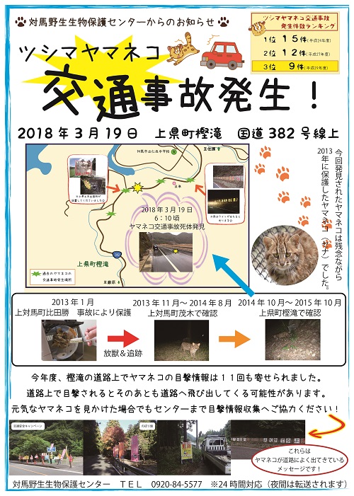ヤマネコの交通事故では、セナのかつての事例のように、事故後に迅速な連絡をいただいたら救える命もあります。また、ヤマネコ見たよ!など小さなこと何でも構いません!今後も安全運転力とヤマネコセンターへの情報提供のご協力よろしくお願いします!対馬野生生物保護センター(TEL:0920-84-5577)