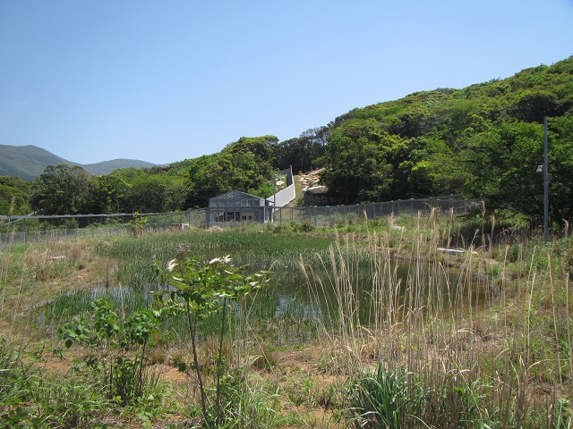 今回は初回ということで、ステーションとここで飼育されているネコたちを紹介したいと思います。ステーションは、下島の豆酘地区にある鮎もどし自然公園の中にあります。ステーションは動物園で生まれたツシマヤマネコを、いつか対馬の自然に帰すための訓練方法を試験する施設として整備されました。ここには、ツシマヤマネコに狩りを経験してもらうための野生順化ケージと、ツシマヤマネコの健康チェックや治療をする一時収容棟があります。ステーションで飼育しているネコたちは、試験の内容や体調にあわせて、これらの施設を使い分けています。