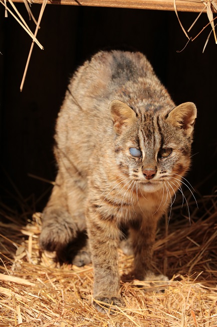 那須どうぶつ王国(栃木県)からやってきた個体です。ステーションに来たばかりの頃は、狩りが上手く出来ませんでした。しかし、広大で自然が豊富な野生順化ケージの中で生活するなかで、野生のネズミはもちろん、野鳥、カエル、昆虫など幅広い野生動物を捕まえられるようになりました。