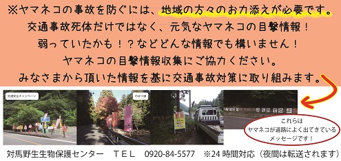 今年度はツシマヤマネコの交通事故0件へ向けて引き続き安全運転ご協力のお願いとツシマヤマネコを見かけましたら情報提供の程よろしくお願いいたします。