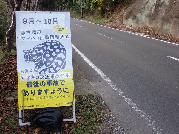 対馬野生生物保護センターでは、仔ネコの目撃情報が相次いでいる上県町佐護に目撃情報看板を設置し、ドライバーへ安全運転の呼びかけを行っています(写真)。運転中に目撃情報看板を目にした際には、道路脇の確認やスピードを緩めるなどの対応を特に心がけていただければと思います。もし、誤ってヤマネコを轢いてしまった際や交通事故にあったヤマネコを見かけた際には対馬野生生物保護センターまでご連絡ください(TEL:0920-84-5577)。